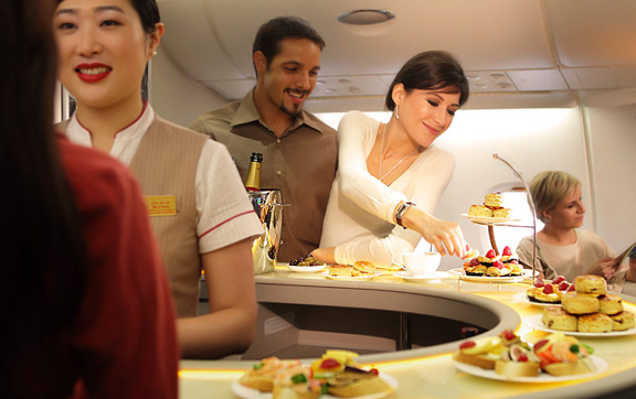 Experience cuisine and service worthy of the world’s finest restaurants in Emirates First Class with a range of dishes, carefully selected and prepared, available on-demand throughout your flight. Presented on Royal Doulton fine bone china with exclusive Robert Welch cutlery, alongside the finest wines in the air, every aspect of your dining experience has been tuned to perfection. Along with extras such as High Tea and hors d’ouevres in the Onboard Lounges, your journey will leave your appetites completely satisfied.