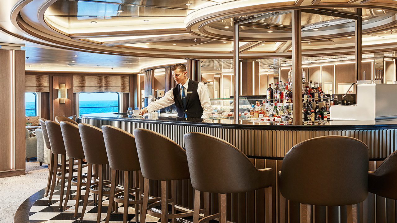 With complimentary cocktails and engaging conversation, live music and a dance floor, The Bar aboard this luxury cruise ship welcomes guests to mix and mingle.