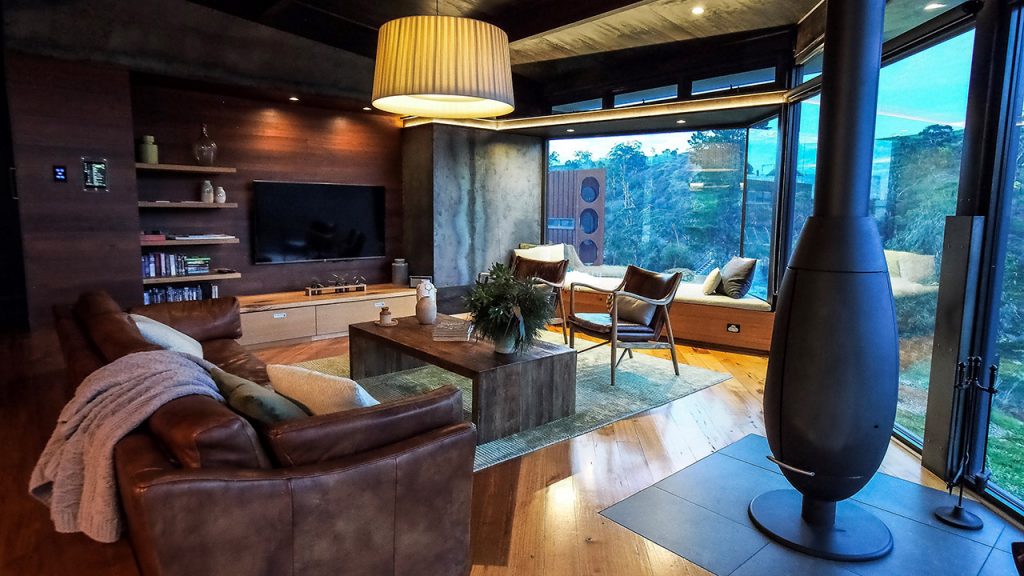 Award-winning clifftop retreats with floor to ceiling windows, panoramic views, flickering fireplaces, and romantic spas.