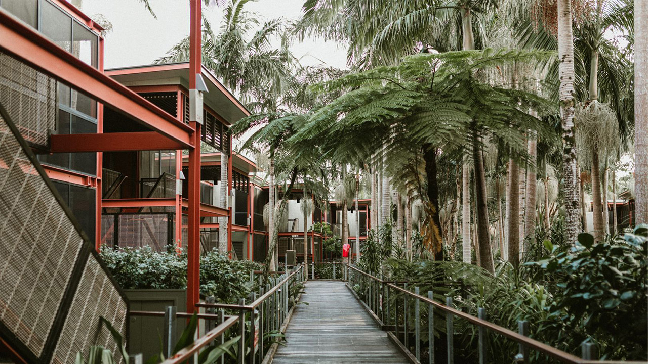 The spacious luxury accommodation comprises 92 one bedroom air conditioned suites. Each suite contains a kitchen, separate lounge and dining area, plasma TV as well as two enclosed balconies. Luxurious bathrooms have deep free standing bathtubs and separate shower and the California king beds ensure dreamtime really does exist. Each suite has been designed to capture the essence of being nestled among the sub tropical rainforest.