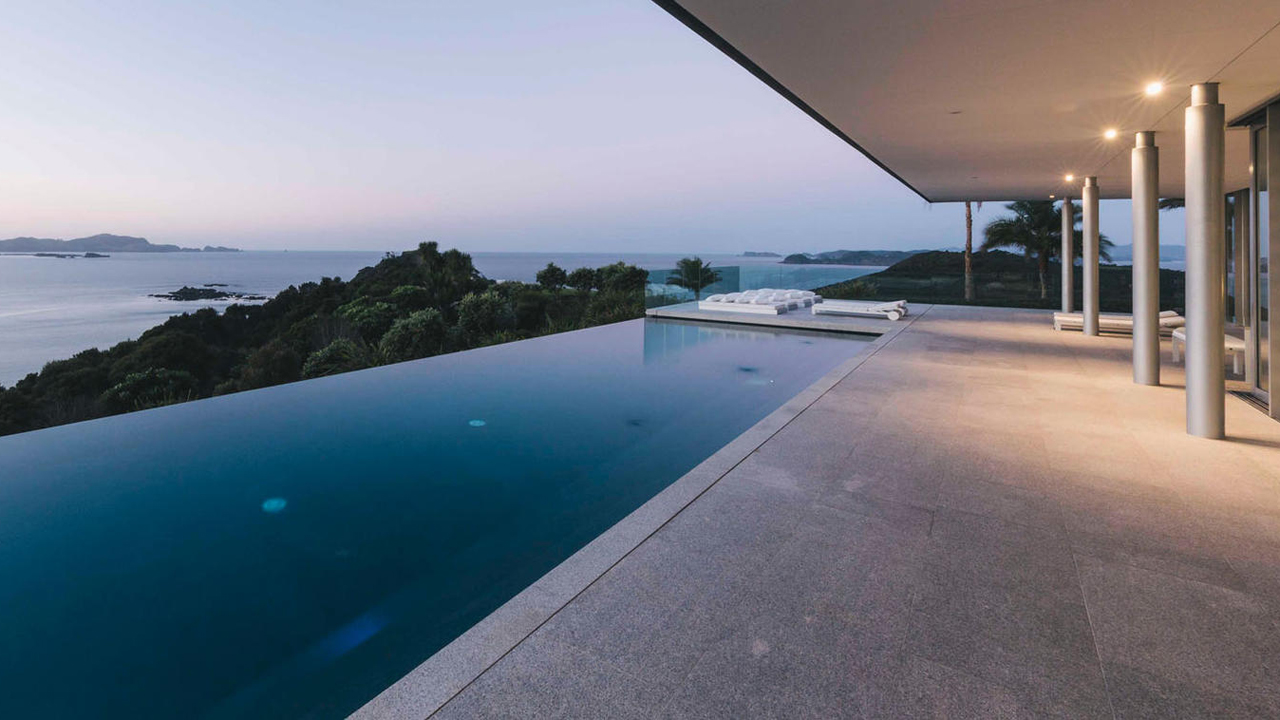 Four superb en-suited bedrooms flank the generous living and entertaining areas. This stunning villa sits on a 44 acre private headland with panoramic views of New Zealand’s famed Bay of Islands. With over a kilometer of beach and ocean frontage overlooking unlimited deep water anchorage this iconic, one of a kind masterpiece also features a 25 meter infinity pool, a helipad and acres of pristine private land and native bush. There is also a gymnasium, sauna, office, service area, and wine cellar to enable both large scale and intimate entertaining and enjoyment with family, friends or business associates.